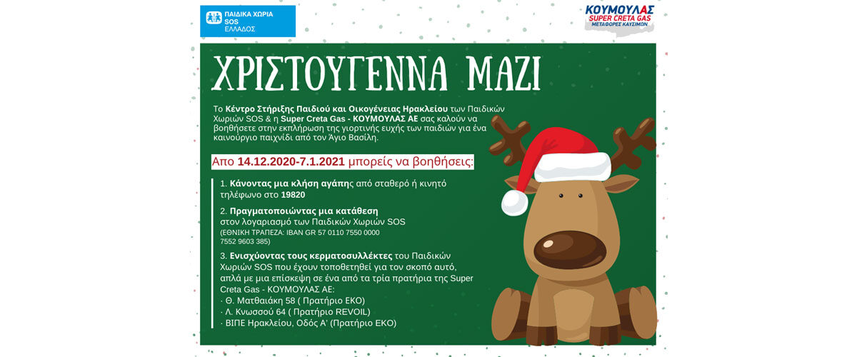 14/12/2020 Η Super Creta Gas – Κουμουλάς Α.Ε και το Κέντρο Στήριξης Παιδιού και Οικογένειας Ηρακλείου των Παιδικών Χωριών SOS κάνουν ”Χριστούγεννα Μαζί” Δράσεις, Νέα