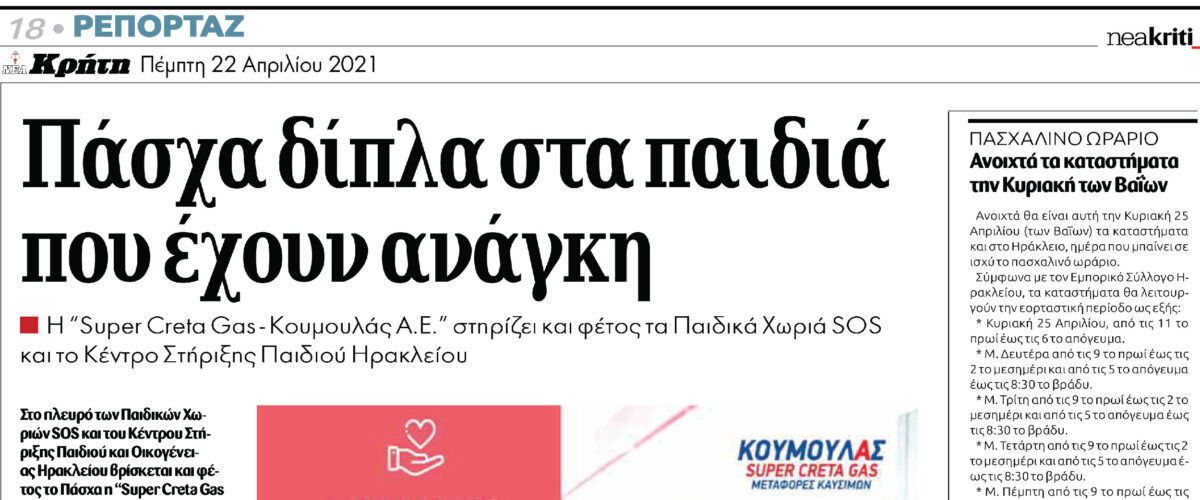 22/04/2021 Και φέτος το Πάσχα η «Super Creta Gas» – Κουμουλάς Α.Ε δίπλα στα Παιδικά Χωριά SOS Δράσεις, Νέα