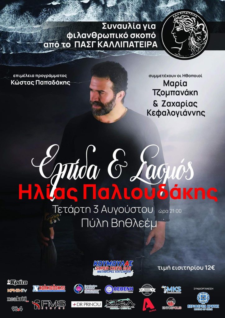 Το πανελλήνιο Αθλητικό Σωματείο γυναικών ΚΑΛΛΙΠΑΤΕΙΡΑ παράρτημα Ηρακλείου Κρήτης, στα πλαίσια των εκδηλώσεων του, διοργανώνει συναυλία για φιλανθρωπικό σκοπό την Τετάρτη 3 Αυγούστου στις 9 μμ στην πύλη Βηθλεέμ στο Ηράκλειο με τον μοναδικό έντεχνο τραγουδιστή Ηλίας Παλιουδάκη. Ο Ηλίας Παλιουδάκης συμμετείχε στην πετυχημένη σειρά του ALPHA (ΣΑΣΜΟΣ)που ξεχώρισε και αγαπήθηκε ακόμα πιο πολύ μέσα από τα ευαίσθητα κομμάτια της σειράς (ριζίτικα, Διασκευή Σασμός, και άλλα) που ερμήνευσε και καθήλωσαν ολόκληρη την Ελλάδα.